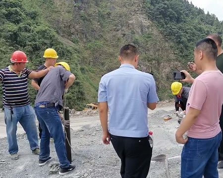 重慶創(chuàng)普達(dá)機(jī)械科技有限公司對施工現(xiàn)場進(jìn)行了勘察,制定了詳細(xì)的施工方案:一天半鉆孔25個(gè),裝管25支,現(xiàn)場臨空面高約7米,采用3.5X3.5X4米一字排形鉆鉆孔,嚴(yán)格控制鉆孔尺寸和一字排形對應(yīng)尺寸鉆孔,最終結(jié)果測量為(裂鏠尺寸)是35米X6米X5.5米共1155方,每支管出方46.2方.